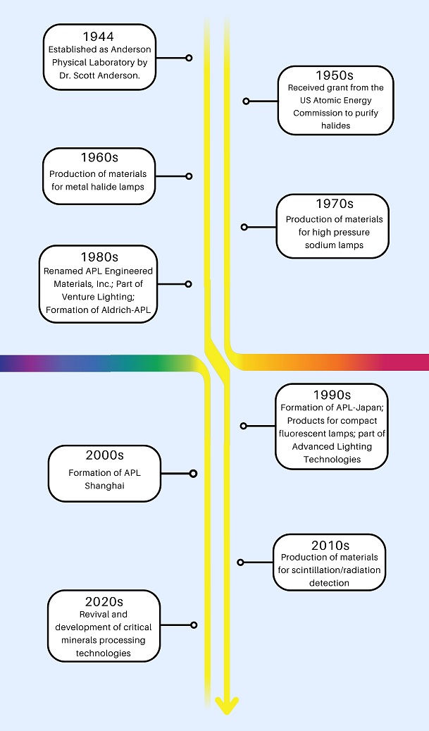 - The Lighting Era (1960s – 2010s): APL pioneered a patented process for producing ultra-dry, high-purity salts and amalgams. These materials dramatically increased the efficiency and life of high-pressure discharge lamps (like those used in street lighting and stadiums), making APL the world’s largest global producer of these specialty lamp chemicals.